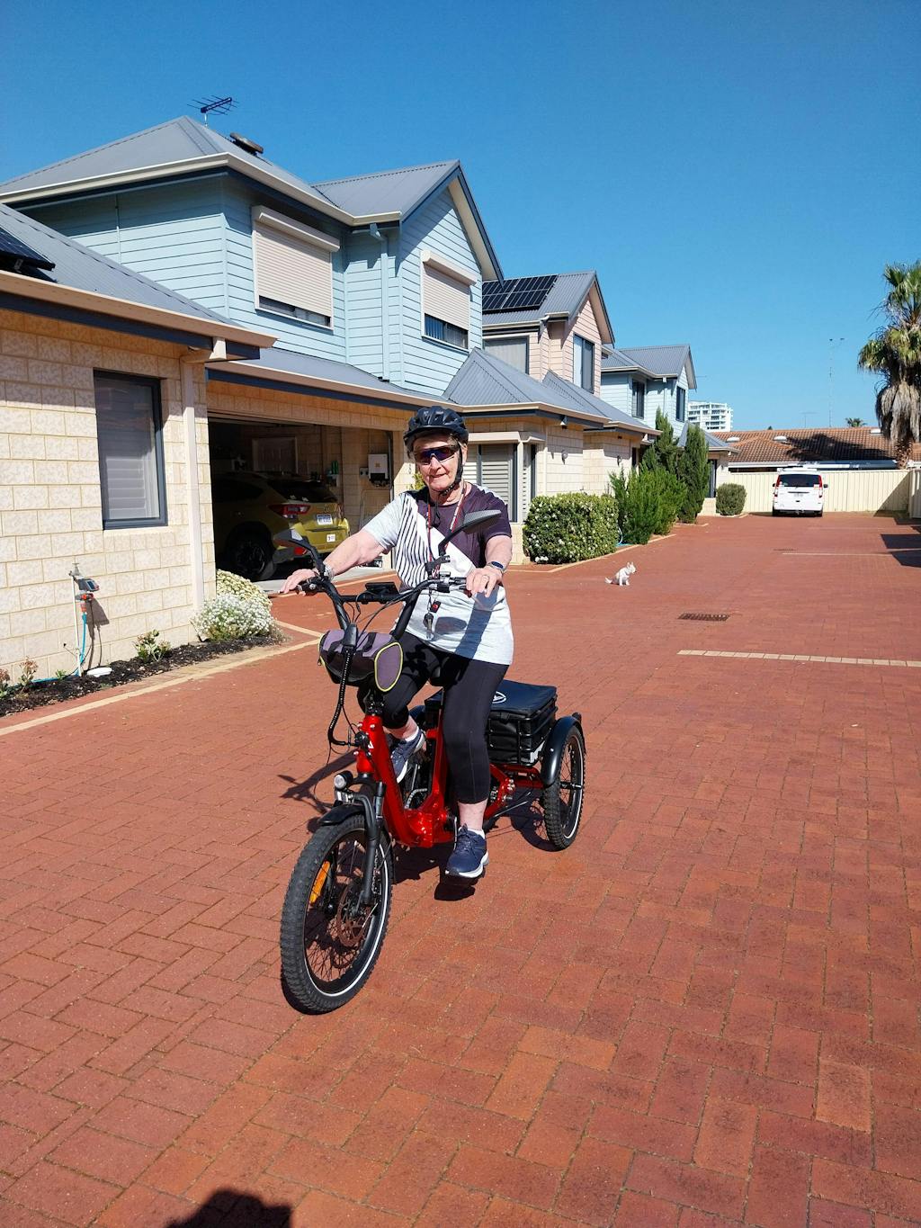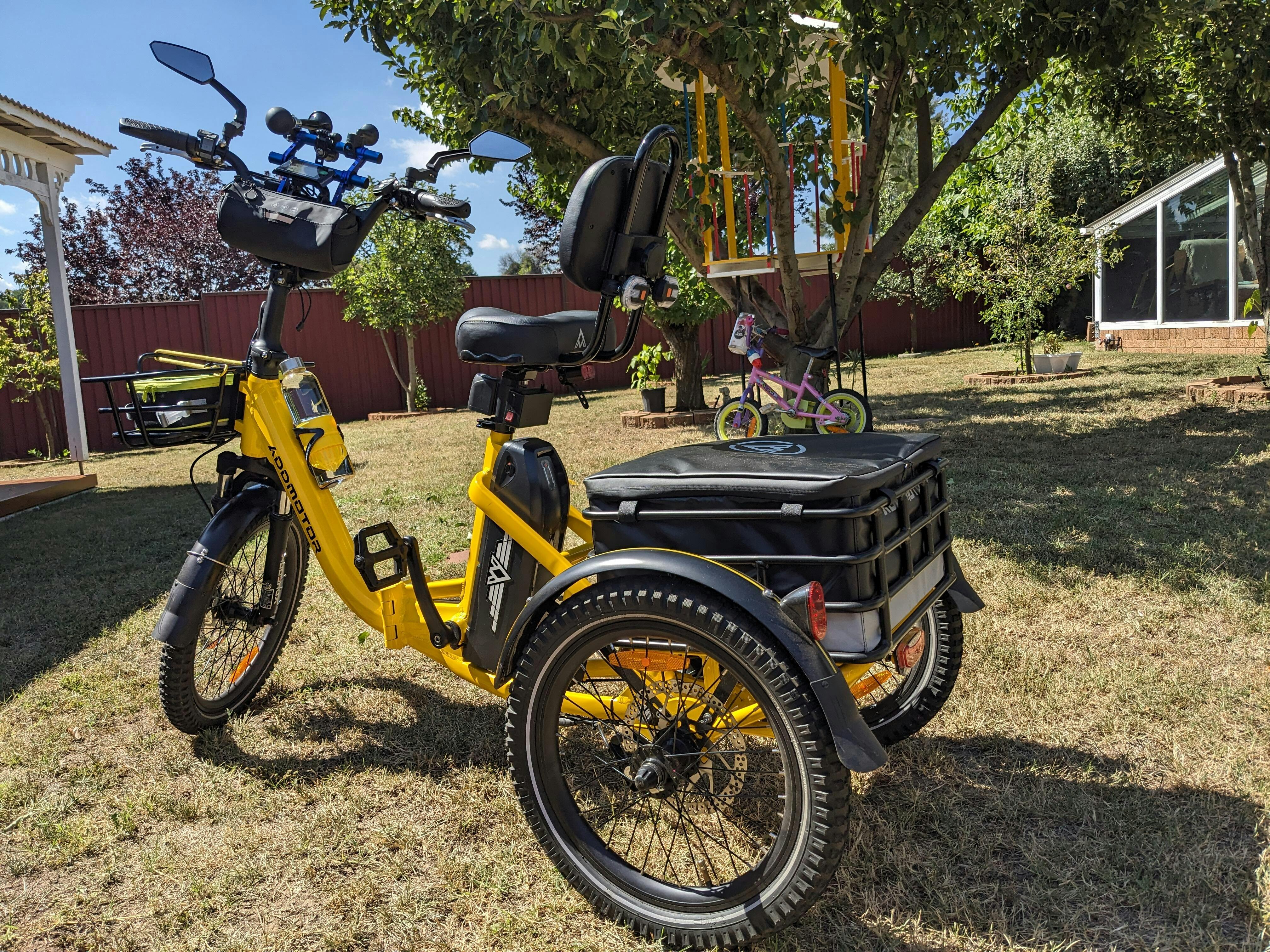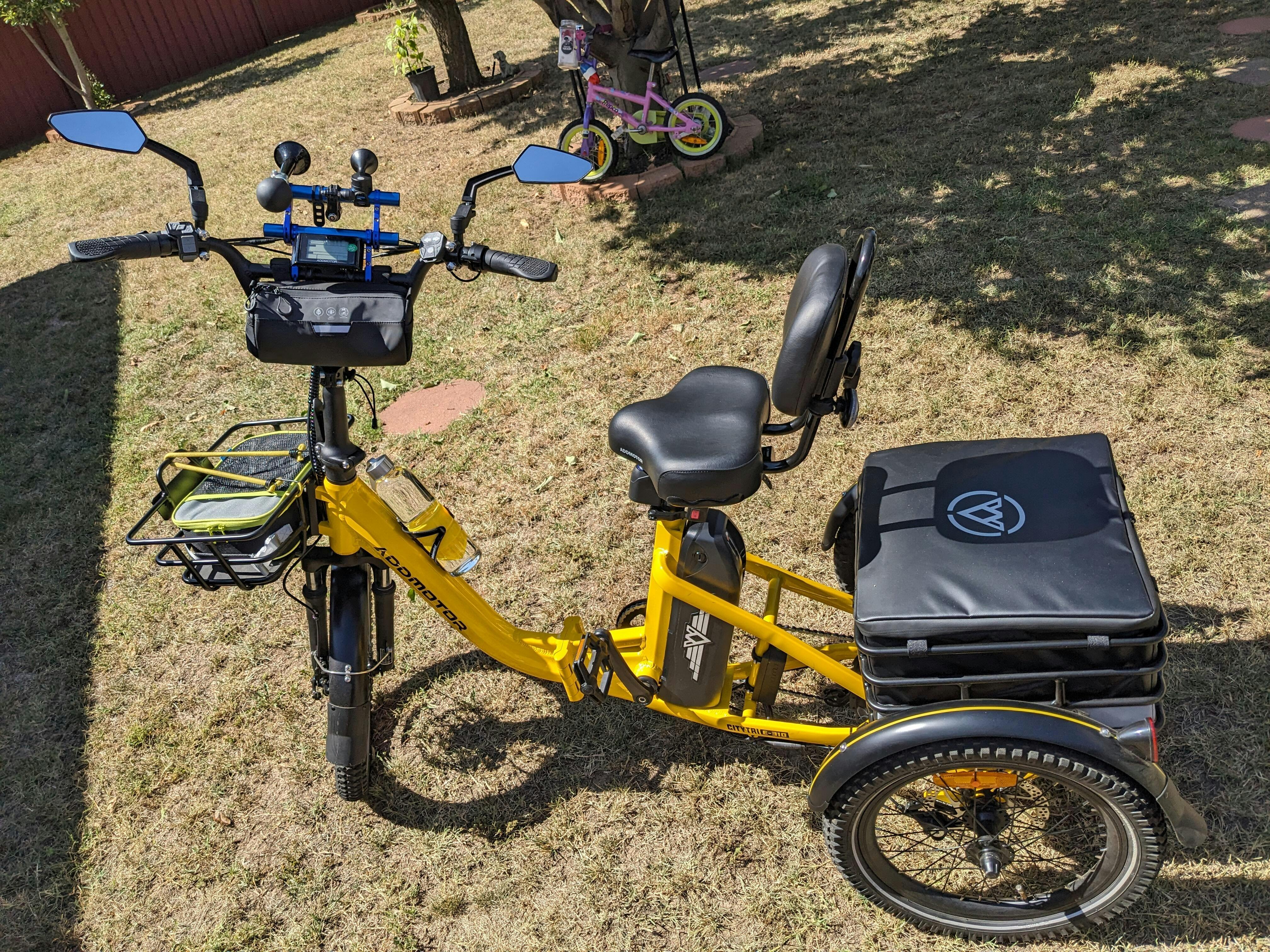 Thank you Addmotor for a great trike. We, myself and my son, are enjoying the new freedom the trike has provided. Our little dog is also enjoying the back basket for a ride to avoid the hot road tar to get to the local park.