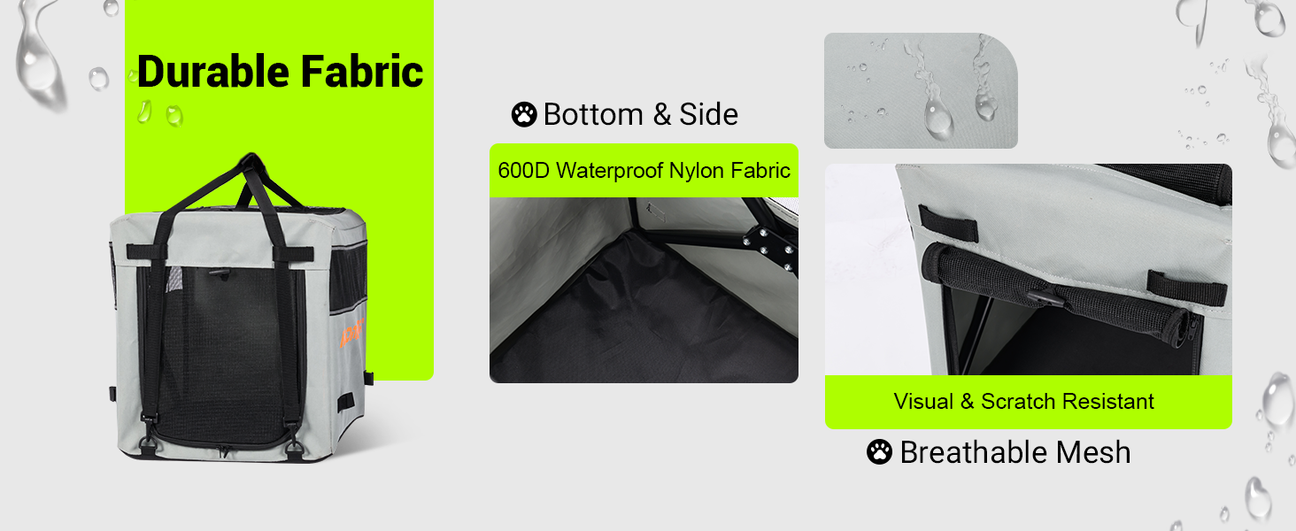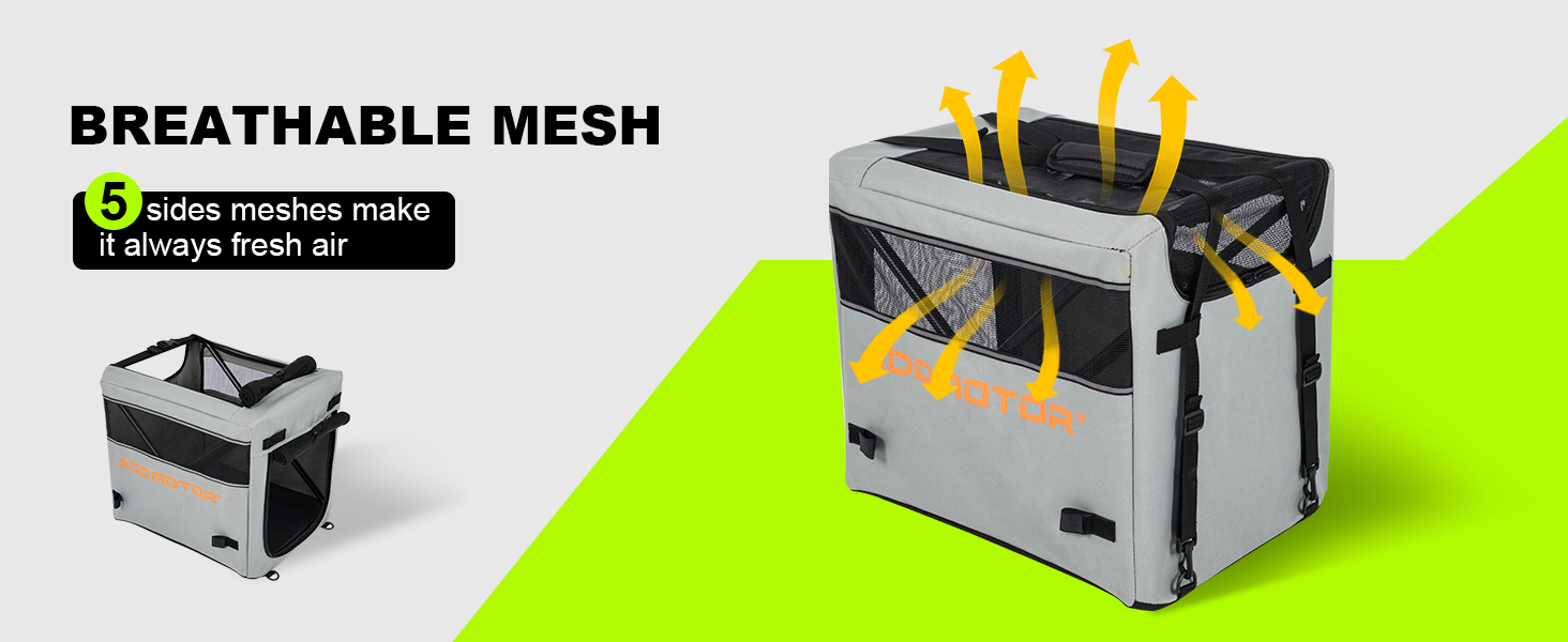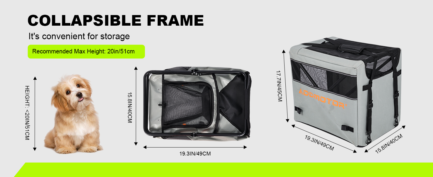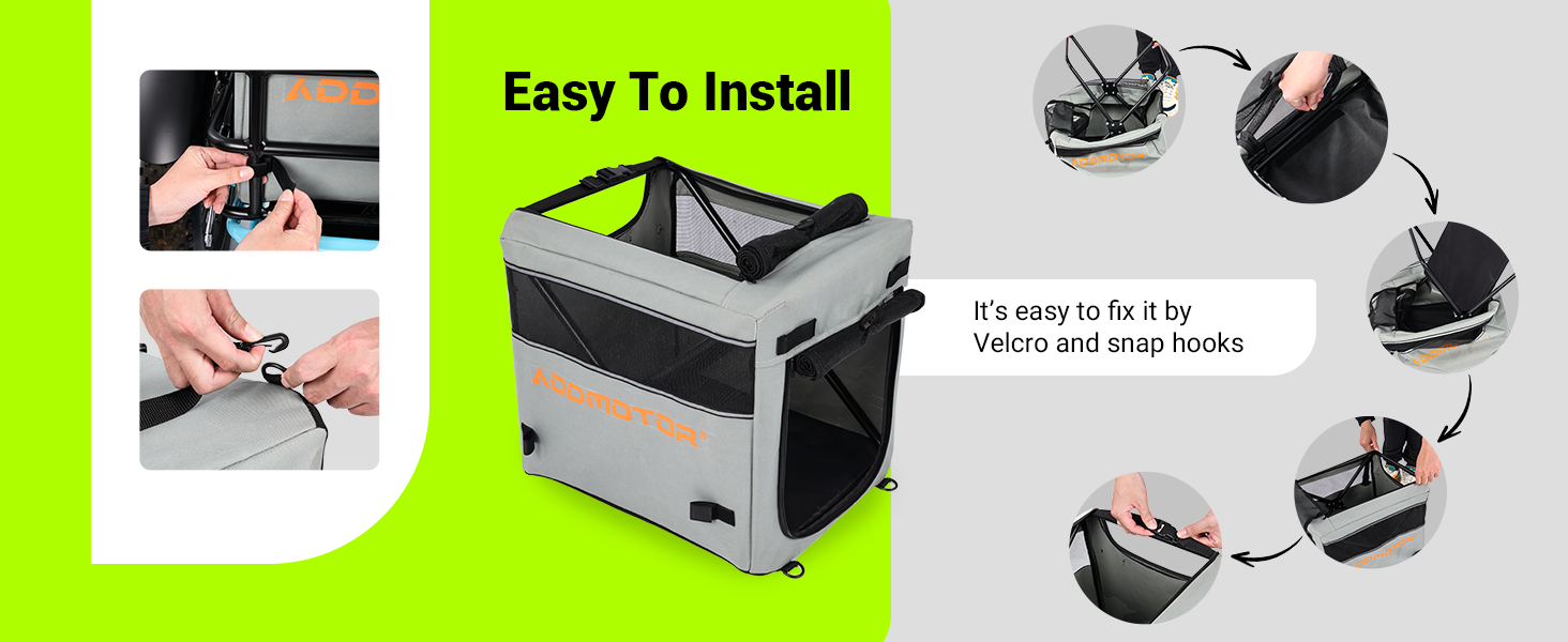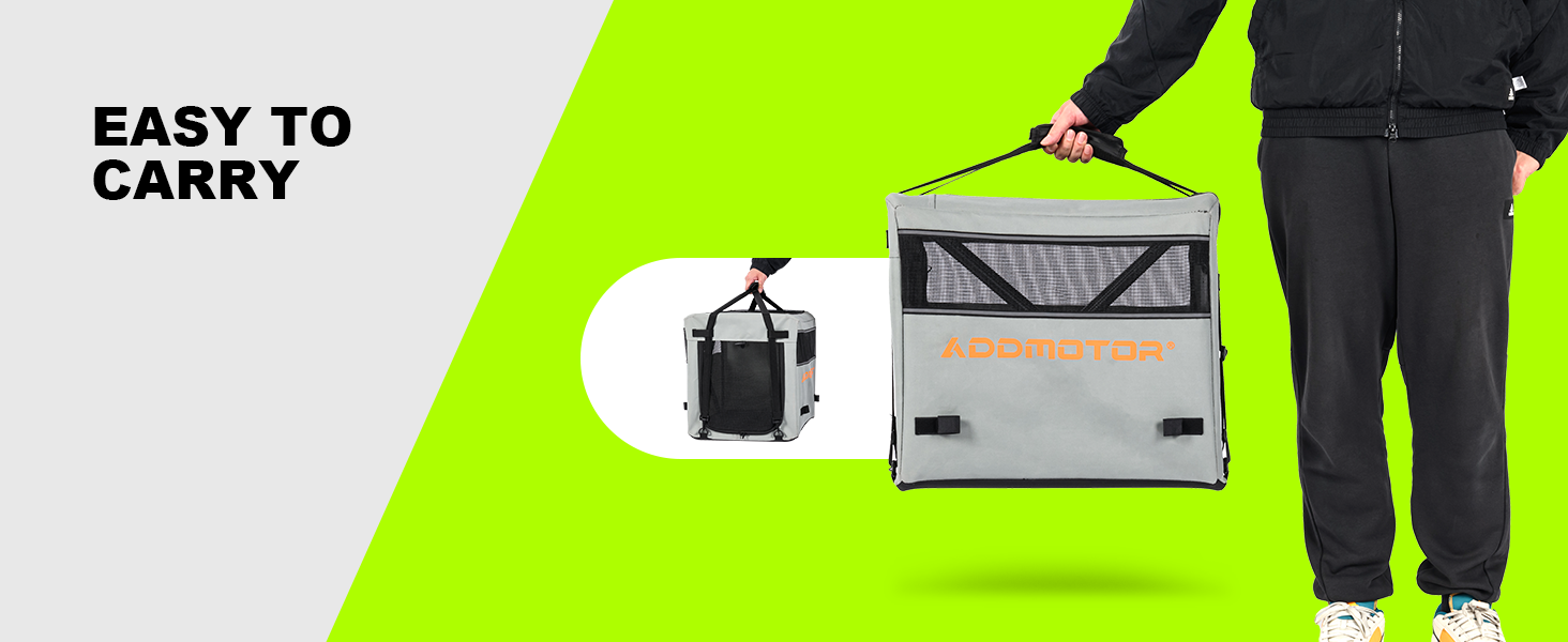 This extra-large pet carrier suits pets weighing 10-25lbs, offering comfort and space. It features a sturdy metal frame, durable 600D nylon fabric, and five mesh panels for ventilation. The carrier easily attaches to Addmotor trikes and has a comfortable handle for convenient, stress-free travel.