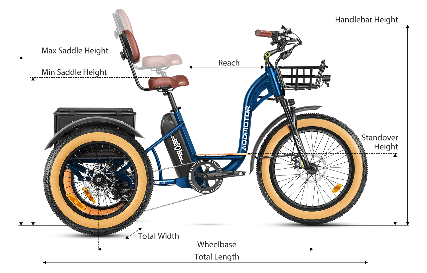 The low step-through design allows you to easily get on and off the trike without awkward leg movements. Perfect for those with mobility challenges, age-related restrictions, or even when wearing less flexible clothing.