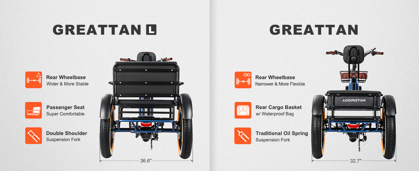 GREATTAN L is a long range electric trike with passenger seat designed for people who want to enjoy riding with family, friends, or lovers. The latest dual battery and 750W rear motor both make it your best choice.